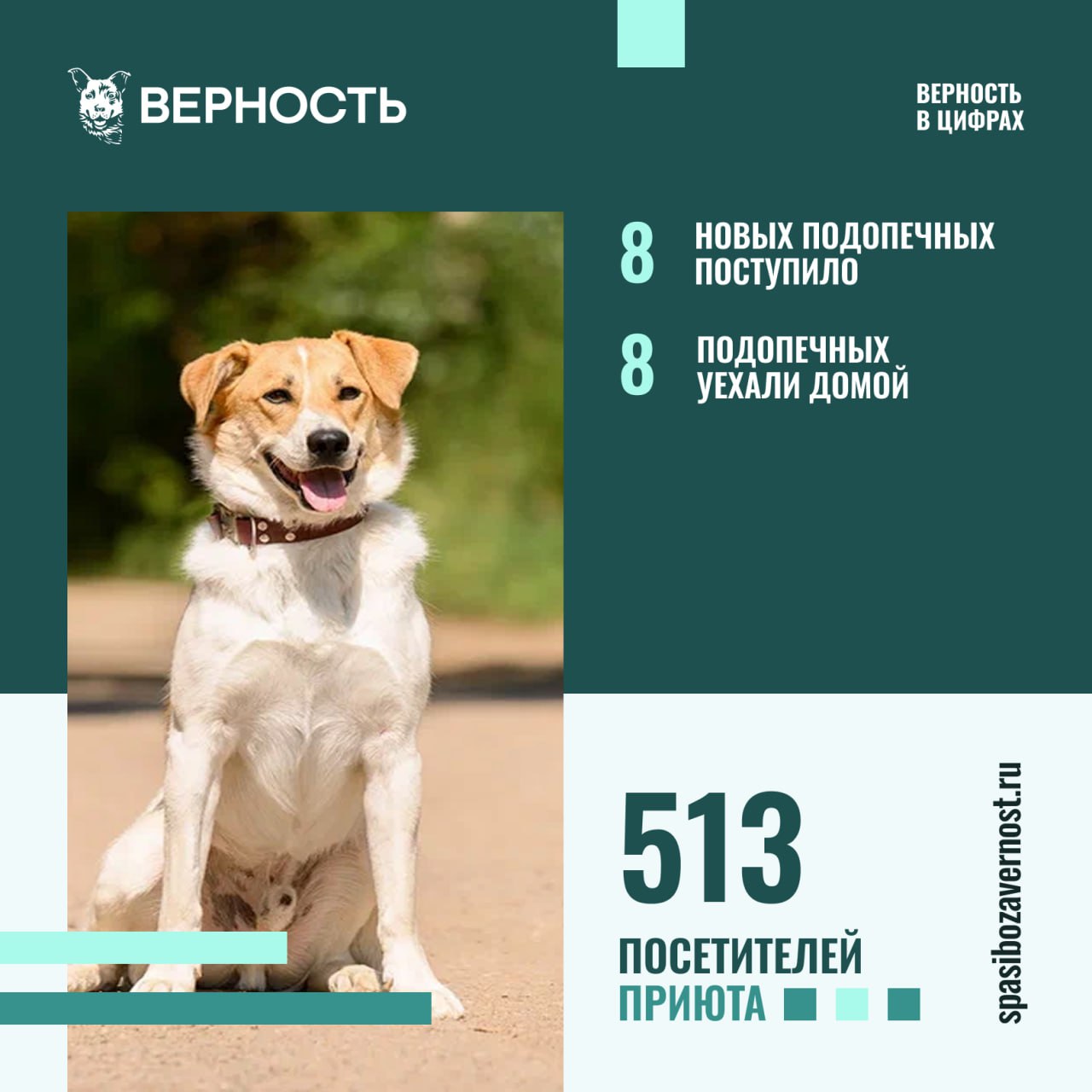 - Наш приют посетили 513 гостей, поступили 8 новых подопечных и домой уехали тоже 8 собак.
