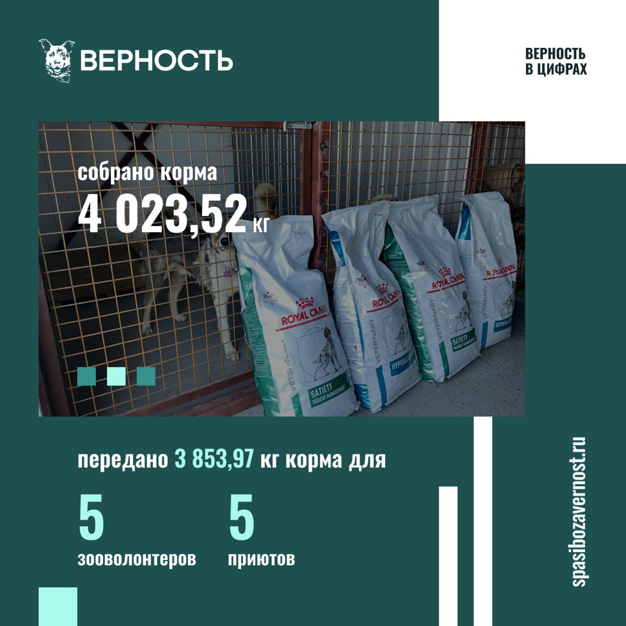 - Передали 5 волонтёрам и 5 приютам 3853,97 килограммов корма.